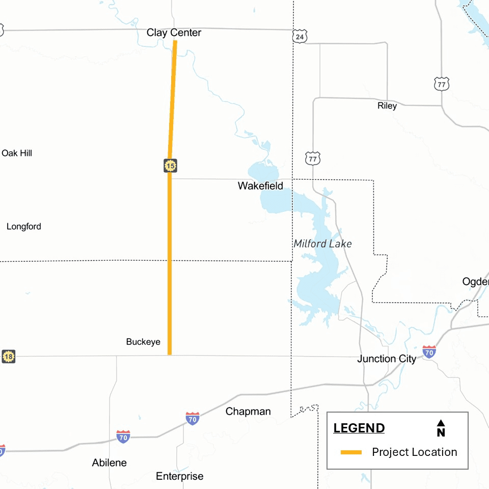 Project work on K-15 will occur south of Clay Center, from the south city limits of Clay Center in Clay County to the east K-18 junction in Dickinson County.